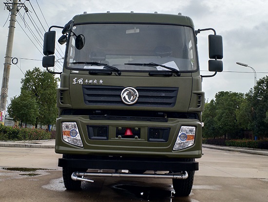 采用東風EQ2180GD5DJ型越野汽車底盤,東風一排半寬體駕駛室,4×4驅動,康明斯ISB190 50國五發(fā)動機,六檔變速箱,東風商用車橋,前驅動橋3.8噸,后橋10噸,10.00R20輪胎,軸距4500mm,電動玻璃,方向助力,斷氣剎,ABS。罐體采用優(yōu)質碳鋼QB235板材,板材厚度4mm,罐體容積11.1立方,變速箱安裝取力器,大功率水泵可泵進泵出,后置工作平臺帶水炮射程25米,消防栓接口左右各一個,選裝駕駛室頂部安裝長條警燈帶喊話器,全車顏色軍綠,兩側噴涂白色森林消防字樣。