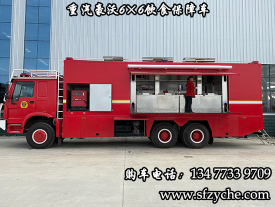 重汽豪沃6×6消防飲食保障車是根據(jù)公安,武警,消防,林業(yè)局,地質(zhì)勘探,水利水電,公路搶險等部門野外執(zhí)行任務的需要,為提高后勤保障能力,改善野外生存條件而研制的一種新型野外自行式炊事車,特別適應快速反應部隊執(zhí)行任務的需要。該車采用重汽豪沃六驅(qū)底盤,車廂為隔熱保溫大板粘接式輕型結(jié)構(gòu),多種供電方式為車內(nèi)各用電設備提供電源。車內(nèi)配有高效的封閉式燃油節(jié)能爐灶、配套設備、各種廚具等。本車具有操作方便、使用可靠、熱效率高,保溫效果好等特點,適應全天候展收作業(yè),是先進的后勤裝備?稍谝恍r內(nèi)供應150人的主副食及開水。備注:據(jù)用戶需求,整車對底盤進行改裝,設有8-13Kw駐車自發(fā)電系統(tǒng),1.5Kw行車發(fā)電系統(tǒng),以及配電系統(tǒng),主副食控制系統(tǒng),作業(yè)監(jiān)控系統(tǒng),水路系統(tǒng),油路系統(tǒng), 附件及工具。
