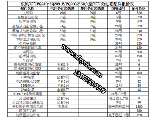 東風(fēng)六驅(qū)軍車EQ240主要分動(dòng)箱配件有:主動(dòng)軸、高檔主動(dòng)齒輪、后橋驅(qū)動(dòng)軸、高檔從動(dòng)齒輪帶小齒、低檔從動(dòng)齒輪帶小齒、中間軸中后橋驅(qū)動(dòng)齒輪、中橋驅(qū)動(dòng)軸齒輪、中橋驅(qū)動(dòng)軸、前橋驅(qū)動(dòng)軸嚙合套、中間軸、前橋驅(qū)動(dòng)軸、半圓鍵、滑動(dòng)齒套限位彈簧、換擋齒套限位鋼球、高低擋滑動(dòng)齒套、7208軸承、主動(dòng)軸軸承7308、7309軸承、7608軸承、9249/54軸承帶隔套、分動(dòng)箱油封、分動(dòng)箱叉形凸緣總成、分動(dòng)箱外殼加蓋總成、前加力總成、前橋驅(qū)動(dòng)軸外殼等。