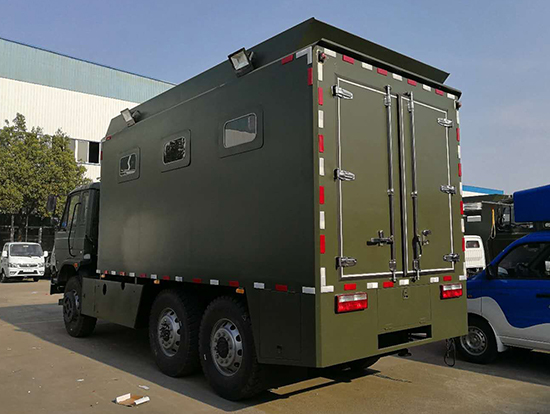 車輛概述:六驅(qū)自行炊事車功能簡介:該裝備主要編配于部隊,為部隊官兵野外作業(yè)時提供良好的飲食保障:具有制作食品、保溫食品和儲存食品的空間與功能、并具有提供開水和餐具消毒的功能。采用東風(fēng)國五越野底盤改裝, 車廂材質(zhì)采用外冷軋鋼板,內(nèi)飾不銹鋼,中間保溫層,隱藏式上車踏步,頂部安全窗,兩個副食灶,一個蒸飯車,抽油煙機(jī),平冷柜,水路,電路,油路等。