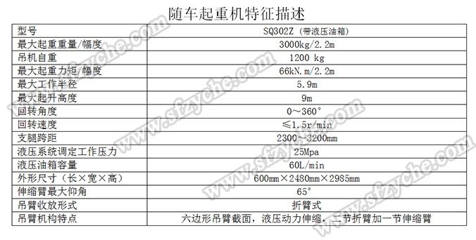 凈功率206kw; 起重機(jī)型號(hào)為:SQ302Z(帶液壓油箱),起重機(jī)質(zhì)量為:1200kg,最大額定超升載荷為:3000kg. 側(cè)防護(hù)金屬材料Q235斷面槽形,螺栓連接,斷面高度40mm,離地高度450mm; 后防護(hù)金屬材料Q235斷面槽形,螺栓連接,斷面高度135mm,離地高度500mm; 安裝具有衛(wèi)星定位功能行駛記錄儀,東風(fēng)越野隨車吊:m.borrowash.com 吊機(jī)詳細(xì)參數(shù):