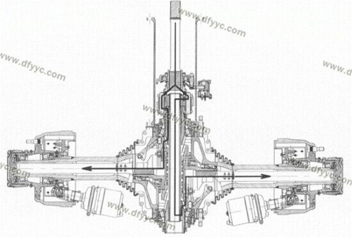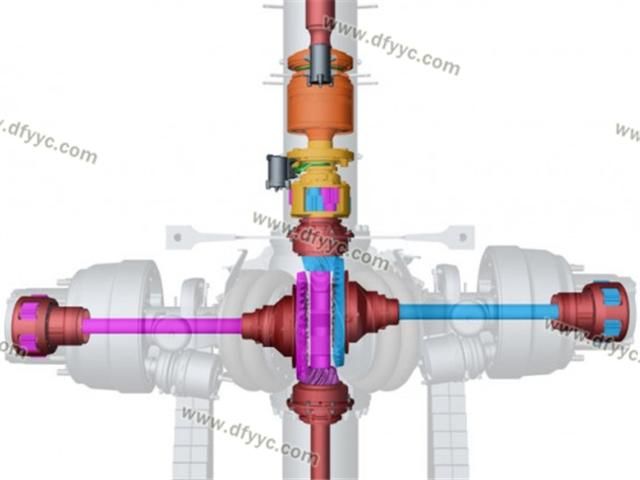 另外,這種斷開式車橋的輪間差速器并不在橋包中,而是被轉(zhuǎn)移到了脊柱套管了,左右側(cè)車輪分別由兩套錐齒輪驅(qū)動,為了讓這兩套錐齒輪互不干涉,其左右半軸在縱向錯開了一定的距離,也就是說它的兩個半軸并不在一個平面內(nèi)。類似的設(shè)計手法裝載機(jī)(4X4軸轉(zhuǎn)向的裝載機(jī))上也有使用,還有采用錯開一定角度的做法來避免左右錐齒輪互相干涉的情況。